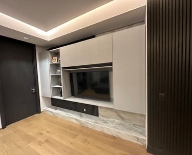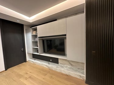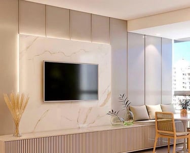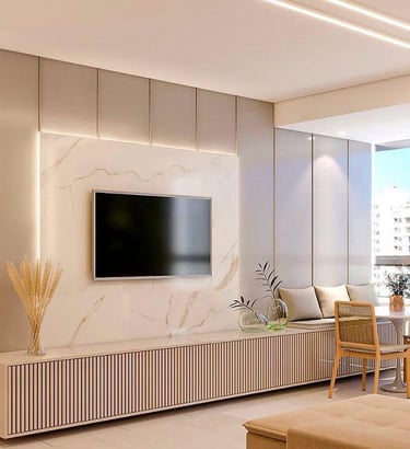 Los muros que rodean el mueble presentan diferentes acabados, como paneles de tela, que aportan un toque de textura y color al espacio. La televisión está colocada sobre una placa de piedra o simulación de piedra, lo que añade un toque de elegancia y sofisticación al diseño.