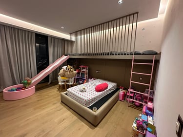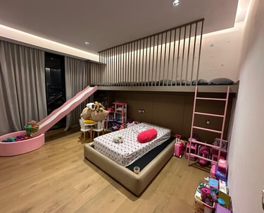 La paleta de colores neutros es ideal para esta etapa de desarrollo, ya que permite que los niños exploren y expresen su personalidad sin distracciones. El tapanco es un elemento emocionante que invita a los niños a jugar y explorar, mientras que la resbaladilla que desemboca en una alberca de pelotas es una delicia para los más pequeños.