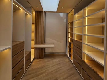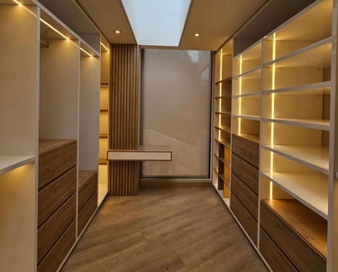 Los cajones en madera de roble son un elemento destacado del espacio, ofreciendo un almacenamiento elegante y sofisticado para la ropa y accesorios. Las repisas en blanco proporcionan un contraste limpio y moderno, creando un ambiente de boutique.
