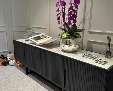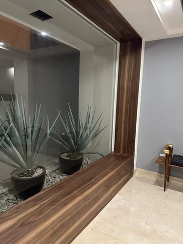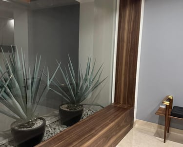 Al entrar al lobby, la primera cosa que llama la atención es la credenza de MDF pintada en un elegante color negro y laqueada para darle un acabado suave y profundo. El estilo vintage de la credenza se nota en sus líneas clásicas y su diseño minimalista, que evoca la elegancia de épocas pasadas.