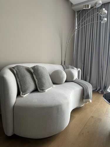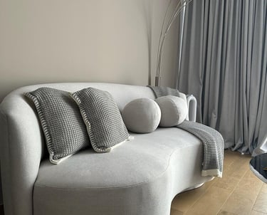 El sofá curvo es el elemento central del living, con su diseño suave y fluido que invita a la relajación. Está tapizado en un gris suave y elegante, que se ve complementado por las almohadas en esfera del mismo tono. Las almohadas agregan un toque de textura y profundidad al espacio, creando un ambiente acogedor y confortable.
