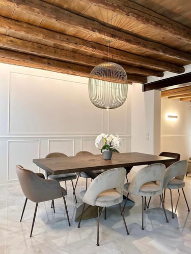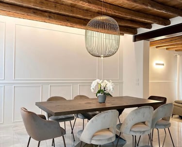 Las vigas de madera en el techo añaden un toque de calidez y textura al espacio, creando un ambiente acogedor y relajado. La lámpara colgante es un elemento destacado en el comedor, con su diseño moderno y su iluminación suave que aporta un toque de elegancia al espacio.