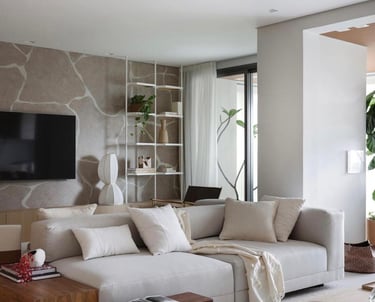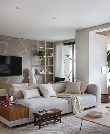 La sala está dominada por un tono beige suave y cálido que se aplica en las paredes, el piso y los muebles. Las almohadas crema añaden un toque de calidez y textura a los asientos, creando un ambiente relajado y acogedor.