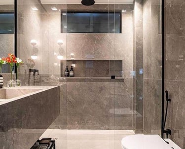 El doble lavabo es un elemento práctico que permite a dos personas utilizar el espacio al mismo tiempo, y los muros con azulejo en tonos gris crean un ambiente sereno y relajante. Los nichos para guardar productos personales son un detalle inteligente que mantiene el espacio organizado y libre de clutter.
