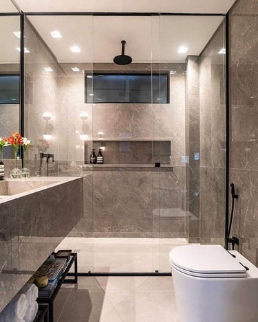 La regadera al fondo es un elemento destacado del baño, con canceles completos que crean un espacio de ducha amplio y cómodo. Los accesorios de baño en negro añaden un toque de sofisticación y elegancia, creando un contraste interesante con el blanco del wc flotante.