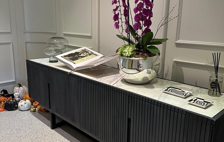 El color negro de la credenza crea un contraste dramático con el resto del espacio, lo que la hace destacar como un elemento central del lobby. La laqueada agrega un toque de lujo y sofisticación, dando la impresión de que la credenza es un pieza de alta calidad.